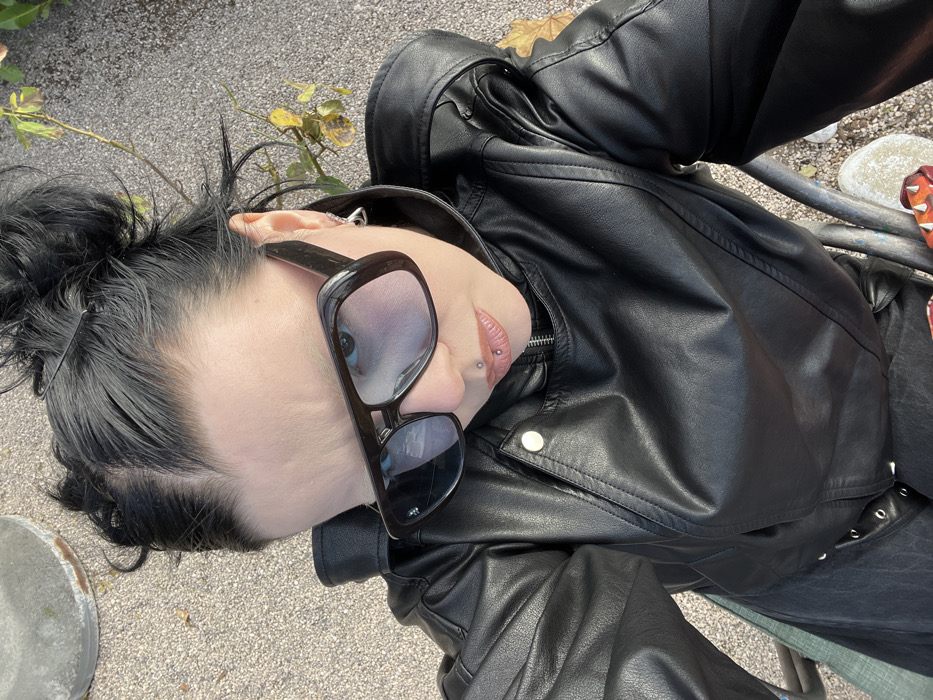 An adult female is depicted in a medium close-up shot, viewed from an elevated perspective. Her dark hair is pulled back into an updo, secured with a dark hair tie. She wears large, dark-framed sunglasses with blue-tinted lenses. A silver-toned labret piercing is visible below her lower lip. She is dressed in a black leather-style motorcycle jacket with a zippered front and a silver-colored snap on the lapel. A small, reflective, curved earring adorns her left earlobe. Below her left arm, gray metallic bars are visible, indicative of seating or a railing. The ground surface consists of light-colored gravel. In the upper left background, a gray, circular metallic object is partially visible, while to the upper right, a thin branch with sparse, yellowish-green leaves is present. The subject's right foot is partially visible, wearing a white shoe with an internal sole featuring a red and orange spiky pattern. The scene is outdoors, within the city of Mostar, Bosnia and Herzegovina. The individual is looking directly towards the camera.