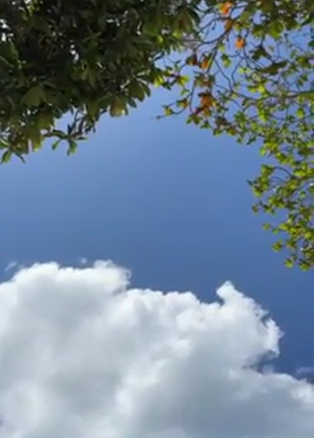 view of the sky from below, framed by tree branches. A large, fluffy white cloud drifts across the bright blue sky. Some of the tree leaves are green, while others are tinged with orange or red, suggesting the beginning of autumn. The camera appears to be static and pointed upwards.