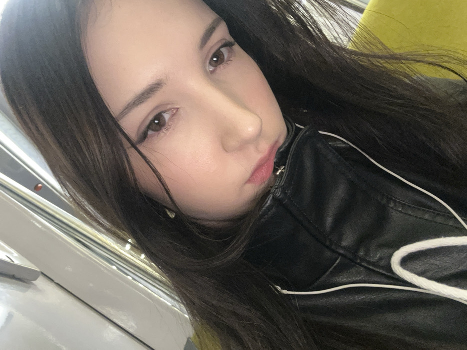 A young woman with long, dark hair gazes at the camera. She wears a black leather jacket with white accents. Her eyes are brown and she has subtle eyeliner. The background suggests she is on public transportation, possibly a train or bus, with a window and a yellow seat visible. The lighting is soft and the image has a slightly angled perspective.