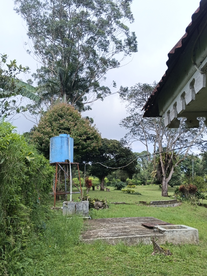 A rural landscape features a blue water tank elevated on a rusty metal frame beside a concrete structure and lush greenery. A tall tree dominates the background, towering over shorter trees scattered throughout a grassy yard. A portion of a building's roof is visible on the right. The sky is overcast.