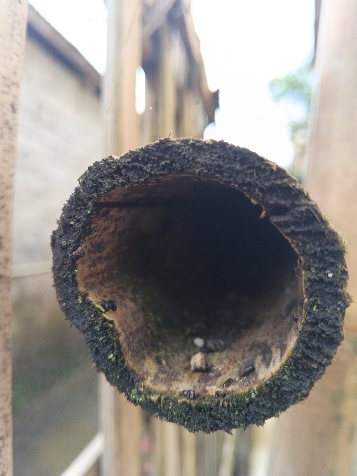 A close-up view shows the end of a hollow, weathered bamboo stalk