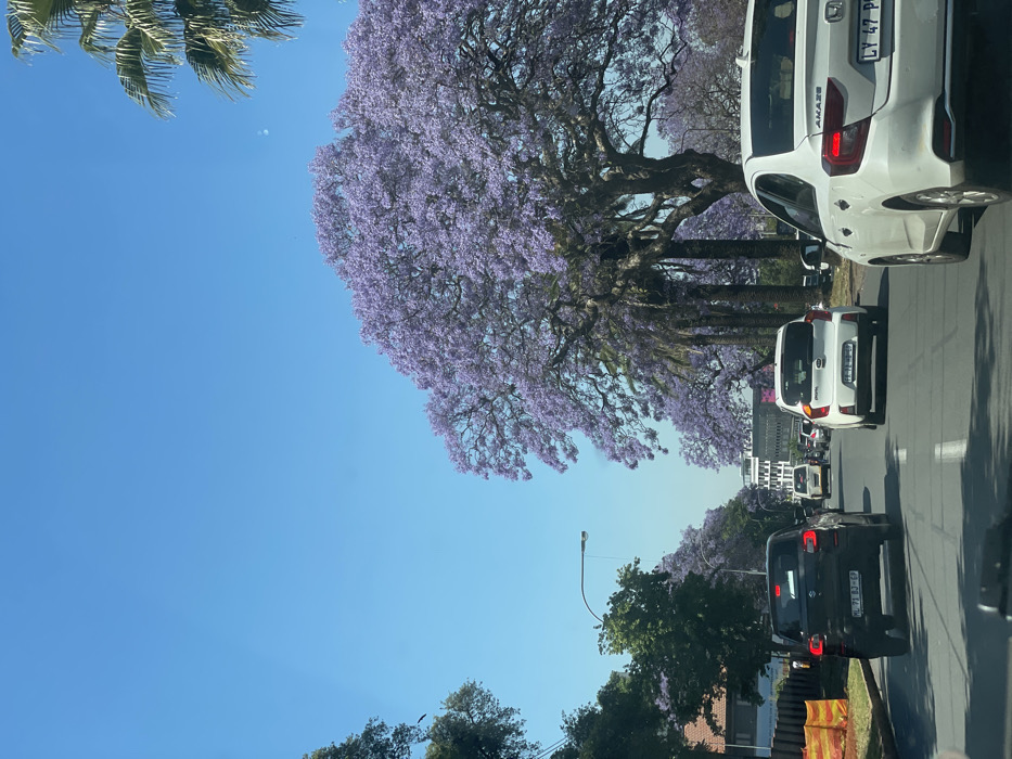 The image depicts a daytime street scene in Rosebank, South Africa, under a clear blue sky. A multi-lane asphalt road with white lane markings extends from the foreground into the distance. In the immediate foreground on the right, the rear of a white Honda Amaze sedan is visible, displaying South African license plate "LY 47 PG GP". In the left lane, a black compact SUV, identified as a Suzuki S-Presso or similar, with license plate "ML 71 BJ GP", has its brake lights illuminated. To its right, in the adjacent lane, a white compact car, resembling a Kia Picanto, is positioned. Additional vehicles, including a white panel van, are visible further down the street. The street is prominently lined on both sides with numerous Jacaranda trees in full purple bloom, interspersed with several palm trees on the right. On the left side, behind green foliage, a building with a reddish-brown roof is partially visible, and urban multi-story buildings are discernible in the background. A streetlight extends over the left side of the road, and orange and white barriers are present on the left pavement.