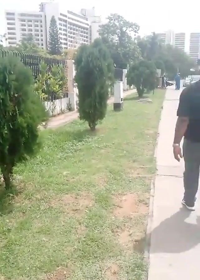 man walking on a sidewalk next to a street with traffic. The man is wearing a black shirt, gray pants, and black and white shoes. He is walking away from the camera and holding something white in his right hand. The sidewalk is made of concrete and there is grass and trees on the other side of the sidewalk. There is a tall building in the background. The sky is overcast.