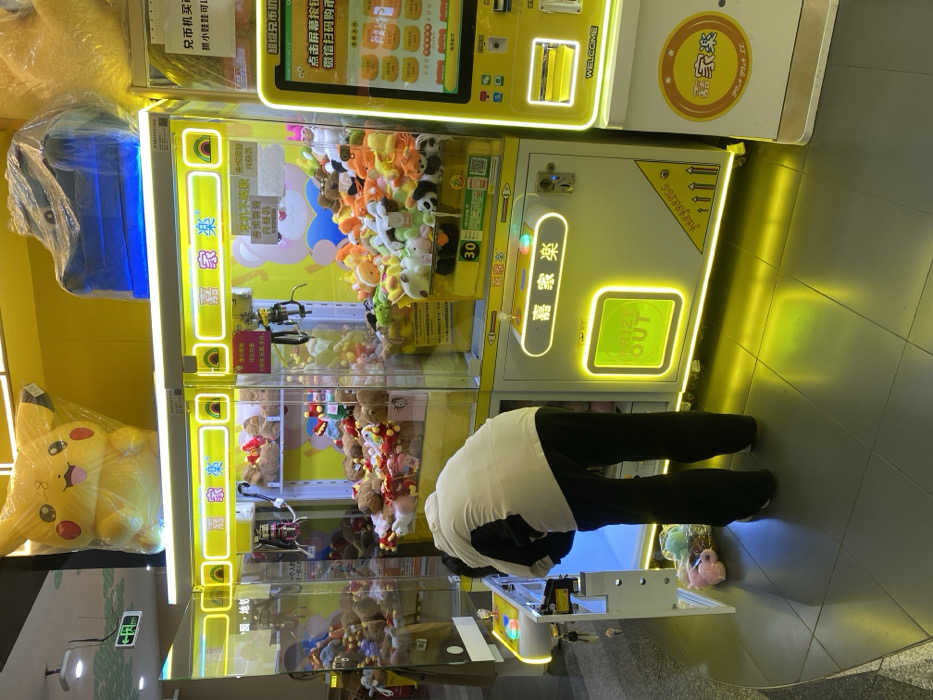 person leaning into an open claw machine filled with stuffed animals. The claw machine is yellow and lit up with LED lights, and has Chinese writing on the front. Next to it is a similar claw machine and another machine with a screen on top. Next to the first claw machine, there are large, wrapped stuffed animals hanging. The floor is gray and tiled.