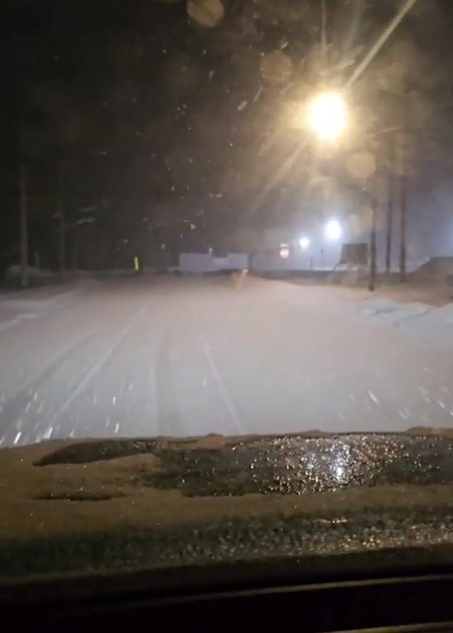 view from inside a vehicle driving on a snow-covered road at night. Snowflakes are visible in the air and accumulating on the windshield. A street light illuminates the road ahead, revealing tire tracks in the snow. Buildings are visible in the distance on either side of the road. The vehicle appears to be moving slowly, navigating the snowy conditions. The dashboard of the car is visible at the bottom of the frame.