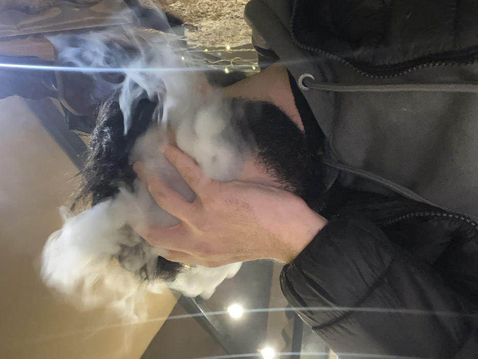 A close-up shows a person with dark hair engulfed in white smoke, likely vaping. A hand is partially visible, seemingly holding the device. The person wears a dark-colored puffer jacket with a gray hoodie underneath. The background is blurry with what appear to be lights, suggesting an indoor setting. The overall impression is one of someone obscured by vapor.