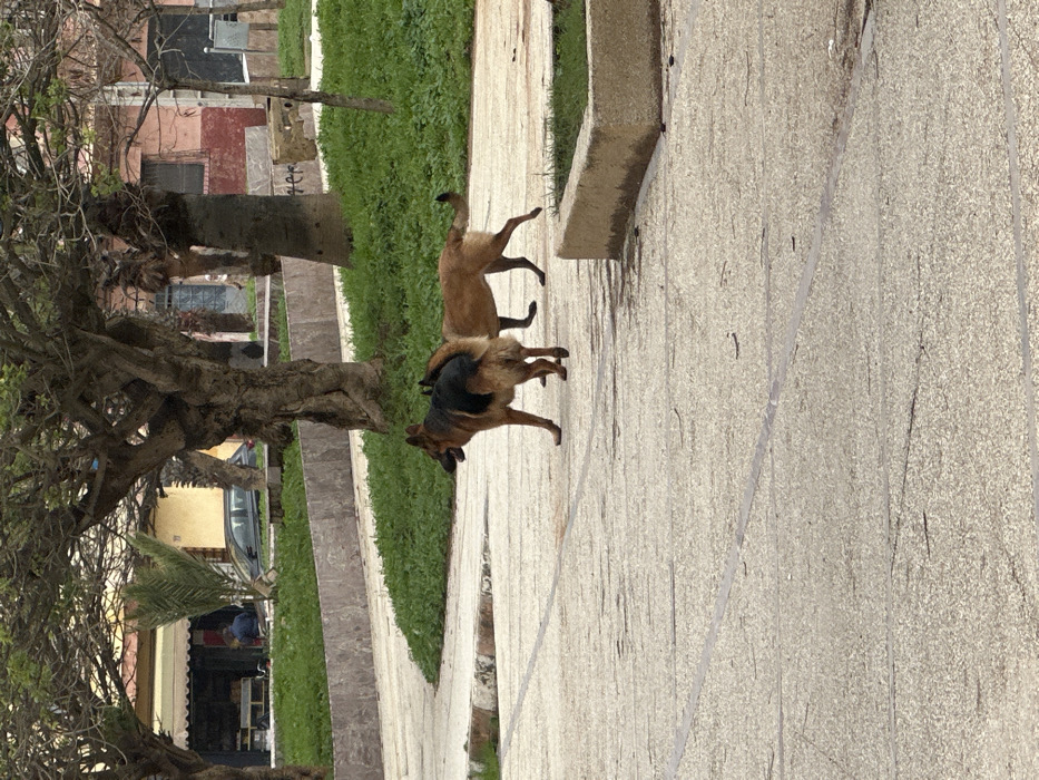 This image depicts an outdoor urban scene in Salé, Morocco. In the foreground, two dogs are walking from right to left across a light-colored, textured paved surface. The lead dog is a German Shepherd with distinct black, tan, and brown markings. Immediately behind it, a second dog, lighter in brown coloration and leaner in build, walks in the same direction. The mid-ground consists of an elevated area with green grass contained by low concrete walls, interspersed with several mature trees featuring rough bark and sparse green foliage. In the background, buildings are visible. To the left, a structure with a light-colored awning is present, with a dark-colored vehicle parked nearby, and a person in a dark top partially visible near the building entrance. To the right, another building with a faded reddish-pink lower facade and lighter upper sections is visible among additional palm trees. The sky is not directly visible, but the ambient lighting suggests an overcast or diffused daytime condition.