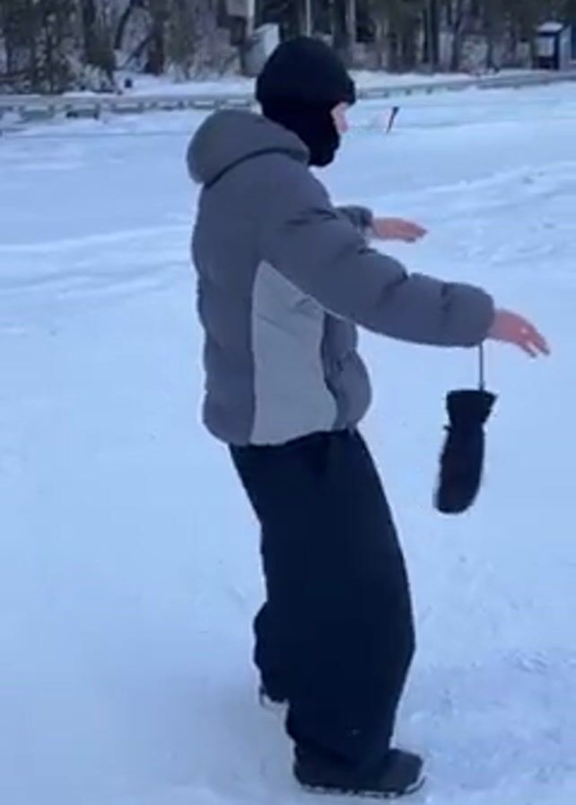 A person in a winter coat, knit cap, and face covering stands in the snow. The person tosses their gloves in the air. They are standing near a tree line on a sunny day.