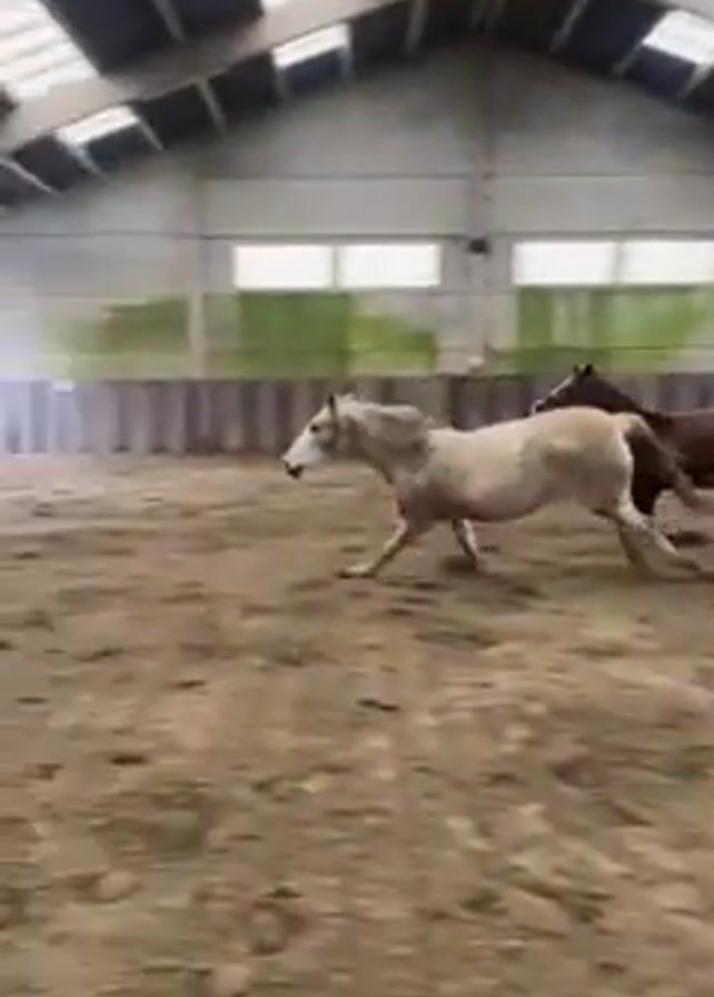 two horses, one grey and one brown, running in an indoor paddock. The grey horse is in the lead and jumps over a low pole obstacle, followed by the brown horse. The paddock has a sandy floor and is enclosed by walls. The ceiling is high and has multiple skylights. The video is shot from a stationary position.