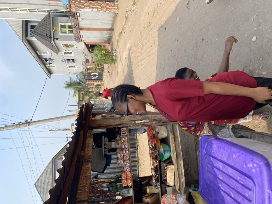 The image depicts a street scene in Ihiagwa, Nigeria, on a clear day. In the foreground, slightly to the left, a makeshift retail stall with a corrugated metal roof and a wooden frame is visible. The stall displays various packaged goods, including multiple loaves of "NOBLE" brand bread on a shelf, along with other snacks and household items. Handwritten numbers are visible on a board attached to the stall. A woman, positioned centrally in the mid-foreground, faces right, smiling. She wears a dark red t-shirt, black framed glasses, and has earphones in her right ear. Her hair is styled in short braids. Behind her, partially obscured by the stall and her body, another person (likely a child) wearing a patterned top is also visible, smiling and looking to the right. A purple plastic storage container with a lid is positioned in the lower left foreground, next to the stall. The background features a dirt road extending into the distance, with a slight curve to the right. On the right side of the road, a multi-story grey building with a distinctive dark grey conical roof accent and numerous windows stands behind a concrete fence topped with barbed wire. Utility poles with multiple electrical wires run vertically through the scene. Another person in a red t-shirt and dark trousers, carrying a backpack, is visible walking away in the mid-distance on the dirt road. Sparse vegetation, including a palm tree, is scattered throughout the scene. The sky is bright and clear.