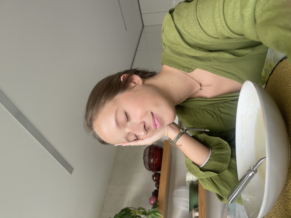 A young adult female is depicted indoors in Matosinhos, Portugal. She has light skin, brown hair, and wears an olive-green V-neck blouse with ruffled accents. Her eyes are closed, and a gentle smile is present on her face as her left hand supports her chin/cheek. She wears a small gold necklace, multiple small stud earrings in her right ear, and a multi-strand bracelet on her left wrist. In the foreground, a white ceramic bowl filled with a light-colored liquid or cream is positioned on a textured, light brown placemat. A silver spoon rests within the bowl. The background reveals a light-colored wall with two wooden shelves on the left. The top shelf holds three dark red/brown decorative containers, one with a circular woven lid. The bottom shelf displays a white bowl with a green interior pattern and a white, conical decorative object. A green potted plant is partially visible on the far left. The ceiling is light-colored and features a recessed linear light fixture. Light-colored cabinetry or wall units are visible in the far-right background.