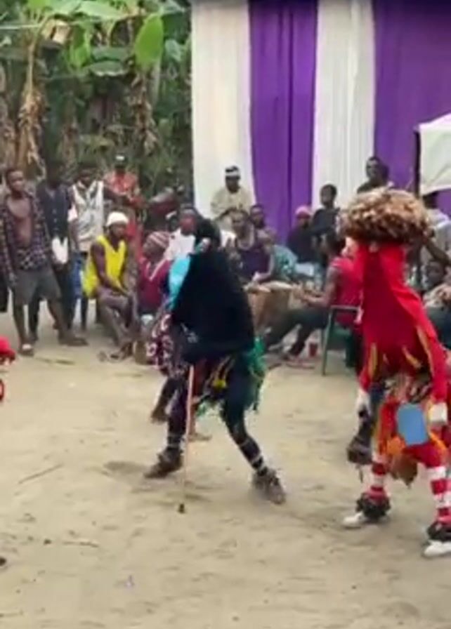 In an outdoor setting, a cultural performance unfolds on a sandy ground, encircled by spectators and performers. Two figures dressed in elaborate costumes, one in black wielding a walking stick, the other in red with a tall, bushy headpiece, engage in a dance. The black-clad figure appears to hobble or move with restricted mobility, utilizing the walking stick. The red-clad performer is energetically dancing. A crowd of observers forms a semi-circle around the performance area, some seated on chairs, others standing. A backdrop of draped fabric in white and purple serves as a decorative boundary to the scene. Lush greenery and foliage are visible in the background, interspersed with a small building. The overall atmosphere suggests a communal celebration, combining artistic expression with a social gathering.