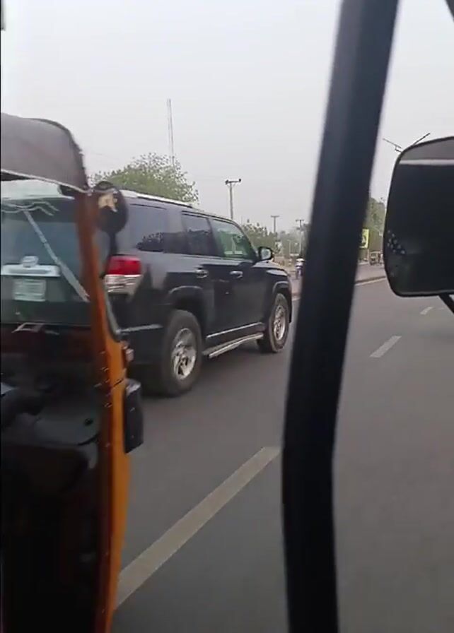 A handheld shot from inside a yellow tricycle (keke) on a gray paved street in a neighborhood