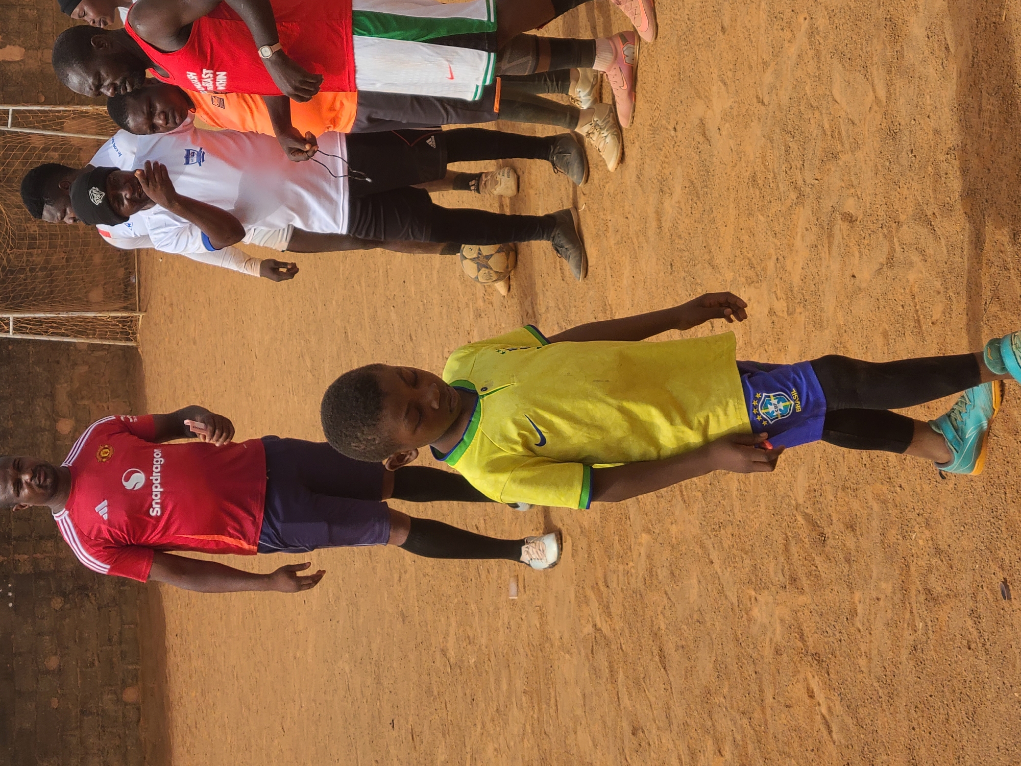 The image depicts an outdoor scene in Barakin Lerawi, Nigeria, on an unpaved reddish-brown dirt field. In the foreground, a young boy, approximately 8-12 years old, with dark skin, stands facing slightly left, head downcast. He wears a yellow short-sleeved soccer jersey with a blue Nike swoosh, blue soccer shorts displaying a "CBF BRASIL" logo, black compression leggings, and light blue athletic shoes. In the mid-ground to the left, an adult male with dark skin stands wearing a red Manchester United jersey, dark blue shorts, black socks, and white athletic shoes, holding a light-colored object in his right hand. To the right of the frame, a group of approximately seven to nine individuals, predominantly adult males with dark skin, are visible. One man in a white short-sleeved shirt and black beanie gestures with his right hand while a black cord hangs from his neck. Another man in a red sleeveless shirt with white and green striped shorts wears a white wristwatch. A younger boy in an orange shirt stands among them. A partially deflated soccer ball rests on the ground amidst their feet. In the far background, a white-framed soccer goal is visible. The immediate background on the left features a low, reddish-brown brick wall. All individuals appear to be standing, possibly observing or engaged in a training session or casual gathering.