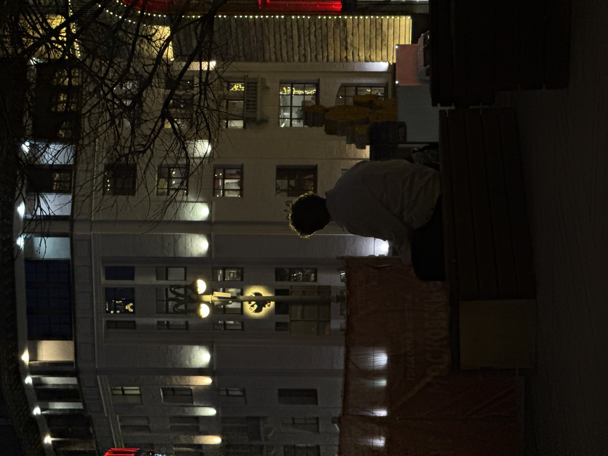 The image displays a nighttime urban scene in Moscow, Russia. A lone individual, seen from behind, with dark, curly hair, sits on a dark wooden bench in the foreground. The person wears a light-colored long-sleeved shirt and faces a brightly illuminated multi-story building. This building features a light-colored facade, multiple windows, and prominent architectural details highlighted by upward-facing spotlights. A streetlamp in front of the building displays a golden double-headed eagle emblem, a national symbol of Russia. In the mid-ground, an orange-brown temporary barrier is present, bearing partially legible Russian text including "МОСКОВСКИЕ" (Moscow's). To the right, a bare-branched tree and a building section with horizontal texture adorned with vertical strands of warm yellow string lights are visible. The scene is dominated by artificial lighting, creating sharp contrasts and deep shadows.