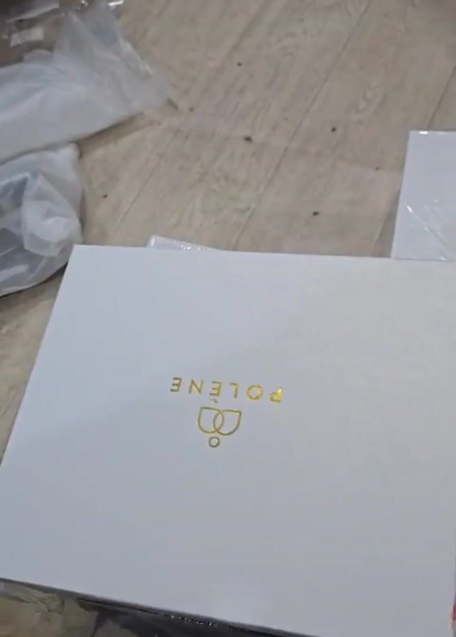 person opening a white Polene box. The box is opened, and inside is tissue paper with the name "POLENE" printed on it. The person reaches into the box. The box is on the floor, which appears to be wood-toned. Other white boxes and clear plastic bags are nearby. The person is wearing black shoes.