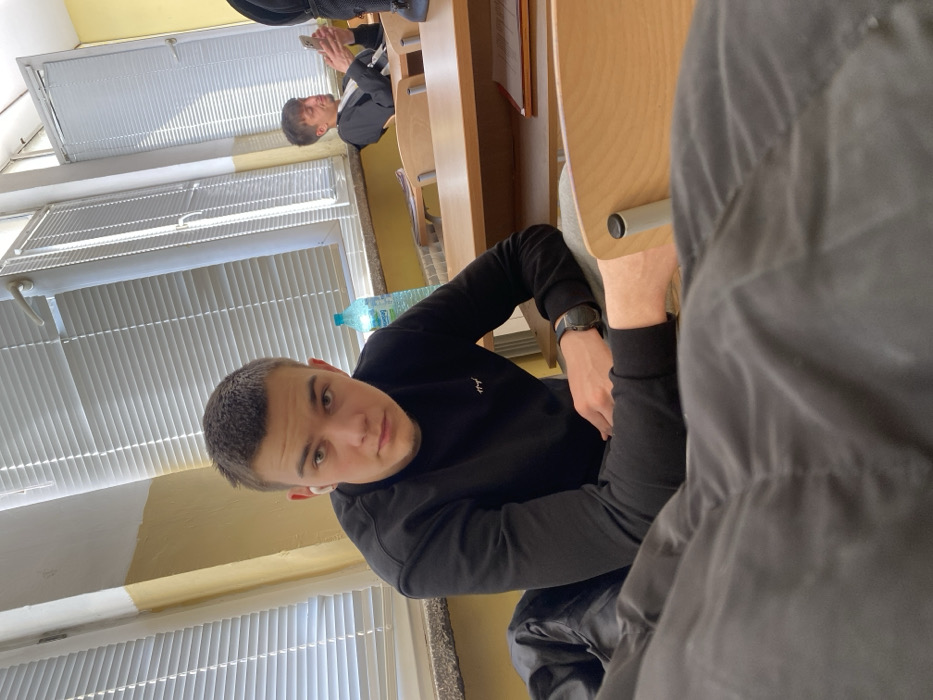 The image depicts an indoor scene within a classroom or lecture hall, identified as a school in Sofia, Bulgaria. In the foreground, a young male, approximately late teens to early twenties, with short brown hair, wears a black long-sleeved shirt with a small white emblem on the left chest. He has a white wireless earbud in his left ear and a dark digital watch on his left wrist. He is positioned at a light wooden desk, his right hand resting on his left forearm, and looks directly towards the camera with a neutral expression. A black jacket is draped on the chair or desk to his immediate left. In the midground, to the right of the primary subject, a clear plastic water bottle with a blue cap and a light blue label (with Cyrillic script) rests on a desk. In the background, further back and to the right, another young male, also in his late teens or early twenties, with light brown hair, is seated at a wooden desk. He wears a dark jacket over a lighter shirt and is looking down at a white smartphone, actively interacting with it. A red folder or notebook is visible on his desk. The classroom features light yellow/cream walls with a darker yellow lower section, separated by a white horizontal stripe. Two windows dominate the background, fitted with white horizontal venetian blinds, partially open to reveal sunlight filtering through. The windows have white frames. The overall lighting is bright, indicating daylight.