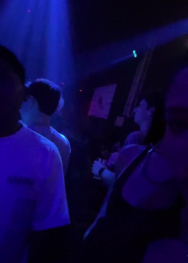 two women in a nightclub setting, with blue and pink lights illuminating the scene. They are facing the camera, and there are other people in the background, some dancing. There's a sign with a heart design in the background.