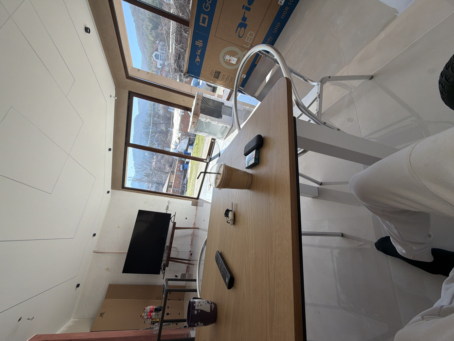 The image captures an interior view within a building in Lozen, Bulgaria, looking outward through large, angled windows towards a sunny, mountainous landscape featuring residential structures and sparse trees. The room's floor is covered with reflective light-colored tiles, and the ceiling is white with geometric lines and integrated black spotlights. Walls appear partially finished with exposed plaster or concrete in sections. In the foreground, the lower body of an individual is visible, wearing light-colored trousers and black socks, seated at a light-colored wooden rectangular table with white metal legs. The table surface holds a dark purple mug with a white graphic, a black remote control, a small white electronic device with wires, a tall plastic cup containing an iced beverage with a straw, a green rectangular packet (likely cigarettes), and a black electronic device. To the left, a large, dark flat-screen television is positioned on a wooden stand. Further left, a dark metal table holds several soda bottles and a dark mug, situated next to stacked cardboard boxes. To the right, a large "Arielli" brand cardboard box for a QLED LED television stands upright, adjacent to a white appliance (possibly a refrigerator) wrapped in protective plastic. A silver-colored chair with a mesh seat is also present near the table. The exterior view through the windows reveals houses with reddish roofs, dormant vegetation, and distant mountains under a clear blue sky.