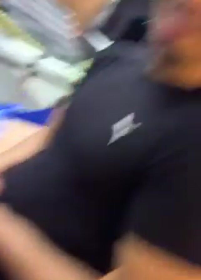 A person wearing black pants and colorful sneakers walks toward the camera. They tilt the camera up to reveal a smiling man with a short beard and mustache wearing a black Puma t-shirt. The man waves to the camera. He is standing in a brightly lit indoor location, possibly a restaurant or cafe, with various objects and decorations visible in the background.