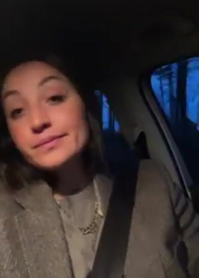 A woman is in the driver's seat of a car, wearing a seatbelt, a grey jacket, and a necklace. She is looking at the camera. The background through the car window is blurry, but it appears to be trees in the twilight. The woman briefly sticks her tongue out.