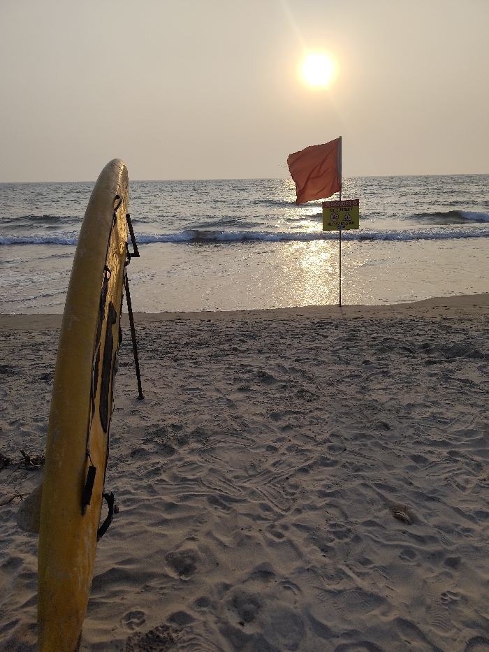 The image depicts a beach scene at sunset in Arambol, India. In the foreground, positioned to the left, a yellow surfboard or rescue board stands upright, supported by a dark-colored metal stand. The sand around it shows various footprints and slight undulations. In the midground, closer to the water's edge, a dark pole is planted in the sand, from which a red, rectangular flag flies, gently ruffled. Below the red flag, a yellow rectangular sign with black text and symbols is attached to the same pole. This sign appears to be a warning or informational notice, though the text is largely illegible due to distance and lighting conditions, showing partial characters like "DO NOT" and "NO SWIMMING." The background features the sea with gentle waves breaking on the sandy shore. The sun, a bright, circular orb, is low in the sky, casting a strong reflection that creates a shimmering path across the water towards the flag and sign. The sky above the horizon is a clear, light gray-blue, transitioning to a brighter hue around the sun. No individuals are present in the scene.