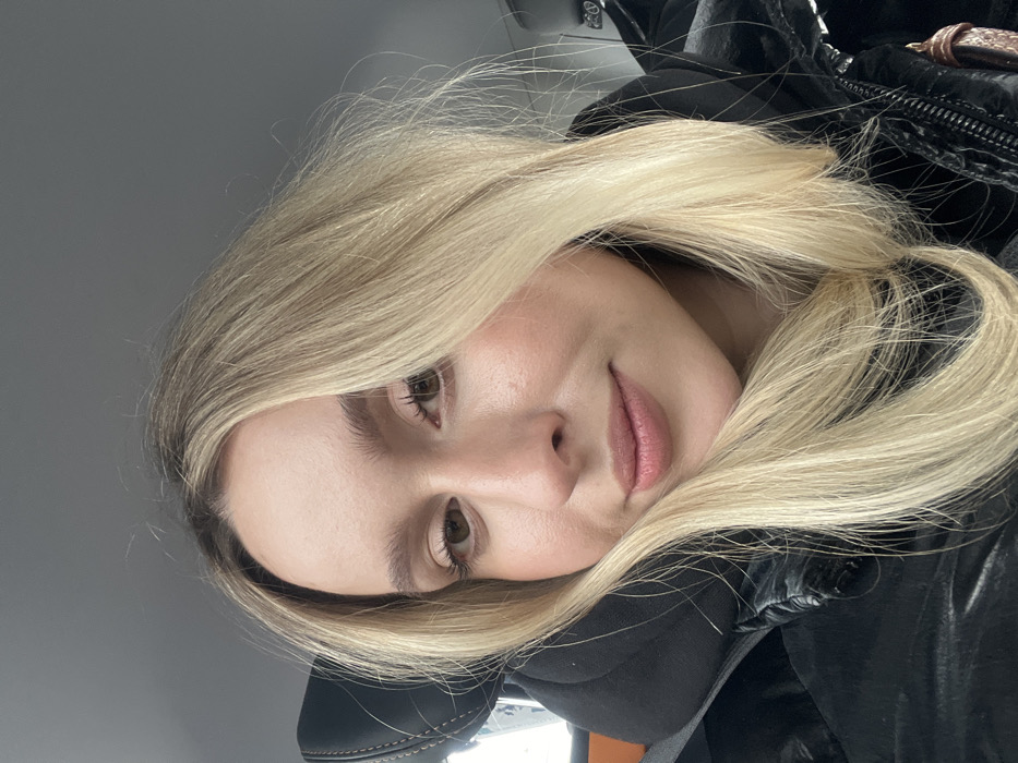 A close-up selfie depicts a young adult female inside a vehicle. She has blonde hair with visible darker roots, parted on the side, and brown eyes. Her complexion is fair, with light makeup applied. She wears a black, shiny hooded puffer jacket over a dark hoodie, and displays a subtle smile towards the camera. The background shows parts of a car interior, including a dark upholstered headrest behind her left shoulder, a blurry light-colored area through a window on the left, and dark, indistinct elements on the right. The scene is lit by soft, diffused light. The image is situated within a vehicle in the city of Minsk, Belarus.