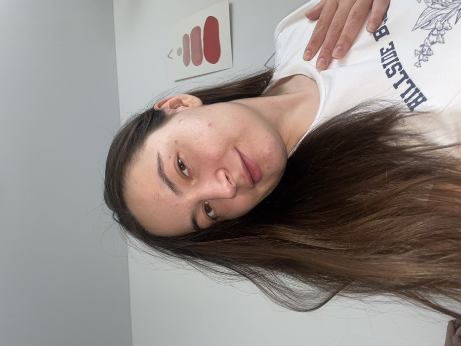 A female individual, appearing to be in her 20s or early 30s, is captured in a close-up, chest-up portrait