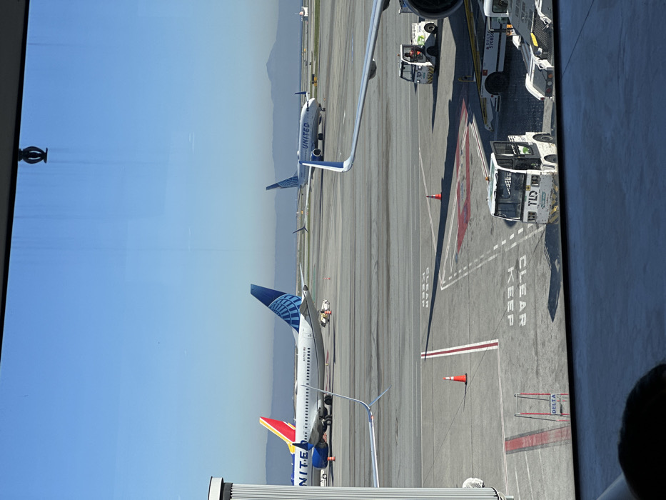 The photograph shows an airport tarmac on a bright, sunny day, as viewed from inside a building. Two United Airlines planes are visible, along with a Southwest Airlines plane. Airport vehicles, including small tractor-like tugs, are parked near the planes. The tarmac displays painted markings and the words "CLEAR KEEP CLEAR". The sky is a clear blue, with mountains visible in the distance.