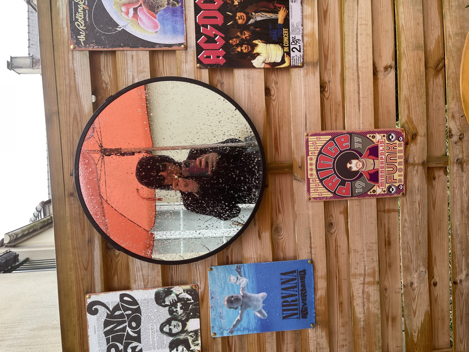 A wooden fence displays various vintage-style music posters. "The Rolling Stones" and "AC/DC" are prominently featured, with the AC/DC poster advertising a December '79 concert. A round mirror reflects a person holding a device. Additional posters include "Prince: Funk Pioneer," "Nirvana: Nevermind," and another with a vintage-style band image and the letter 'O'. The overall aesthetic suggests a music-themed outdoor space. Water droplets are visible on the mirror.