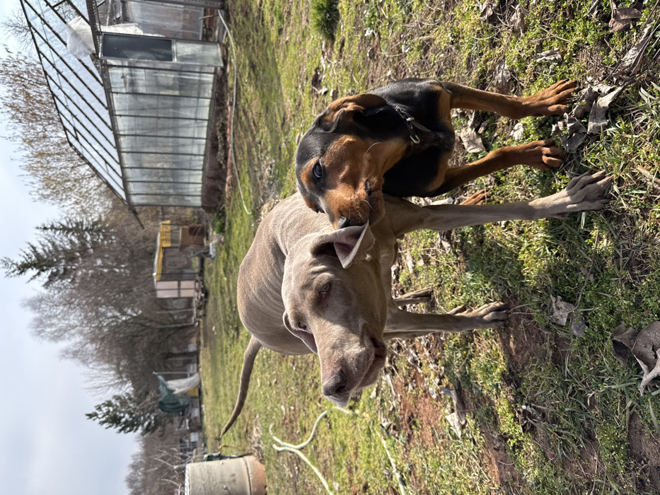 The image captures two dogs interacting outdoors in Begunovtsi, Bulgaria, under bright daylight conditions. In the foreground, a light brown-grey dog, consistent with a Weimaraner, stands facing generally right, with its head turned towards a smaller black and tan dog. The black and tan dog, wearing a dark collar, is positioned to the right of the larger dog and is gently mouthing or tugging the larger dog's ear. Both animals are situated on uneven ground covered by green grass, interspersed with bare soil patches and dry leaves. The immediate environment features strong sunlight casting distinct shadows. In the mid-ground, to the right, a large greenhouse structure with a glass or clear panel roof and sides is visible, appearing somewhat weathered. Further into the background, a smaller, yellow-roofed shed or enclosure is present. The far background consists of a dense line of deciduous trees, many appearing bare, suggesting a transitional season. On the far left, a grey concrete cylinder or well-like structure is partially visible, with a light-colored hose or cable lying on the ground nearby.
