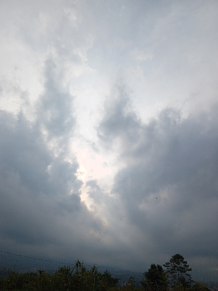 The image depicts an expansive, heavily clouded sky over Thotagamuwa, Sri Lanka, observed from an elevated perspective. Dark grey and lighter grey cumulus-like clouds dominate the frame, with a brighter, diffuse light source visible through a central opening in the cloud cover. A solitary dark avian silhouette is discernible in flight towards the middle-right portion of the sky. In the lower fifth of the image, the dark silhouettes of treetops and other dense foliage form a ragged horizon line, obscuring a distant, indistinct landscape that may contain faint urban or rural structures. A thin, dark linear element, possibly a power line or wire, traverses horizontally through the lower-middle section of the scene. No discernible human subjects or explicit interactions are present. The overall lighting is diffused, consistent with an overcast day.