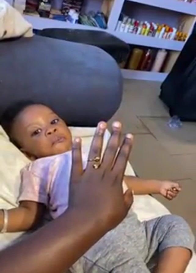 A baby lies on their back, wearing gray sweatpants and a pink t-shirt. A dark-skinned hand, wearing a gold ring, moves in front of the baby, appearing to play with the baby's face and tummy. The background features a shelf stocked with various items, a bean bag-style chair, and what looks like a black suitcase. The baby looks around the room, seemingly curious. A song plays in the background.