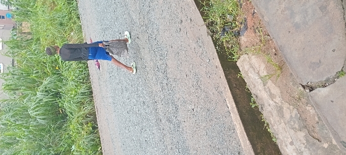A person walks along a gray asphalt road. The person wears a dark shirt, blue shorts, and white flip-flops, and carries a dark bag. Tall, green grass grows on the left side of the road. On the right, a concrete drainage ditch separates the road from a lighter gray concrete surface with a crack.
