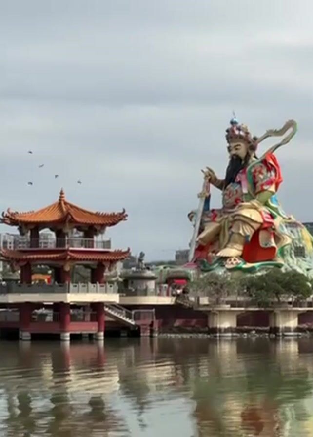 large statue of a seated figure holding a sword in a body of water, with a traditional pagoda structure next to it. The statue is brightly colored, with a long beard and a crown. The pagoda has a multi-tiered roof and red columns. The water reflects both the statue and the pagoda. Birds fly in the sky, which is overcast. The buildings can be seen in the distance.