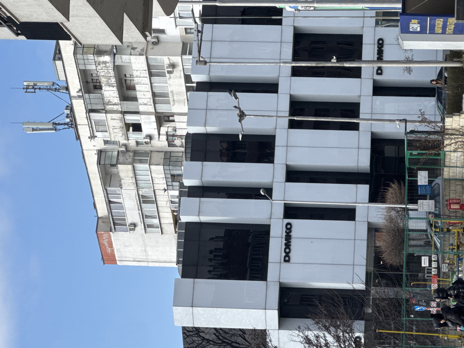 The image displays an urban scene in Varna, Bulgaria, featuring the DOMKO store located at ul