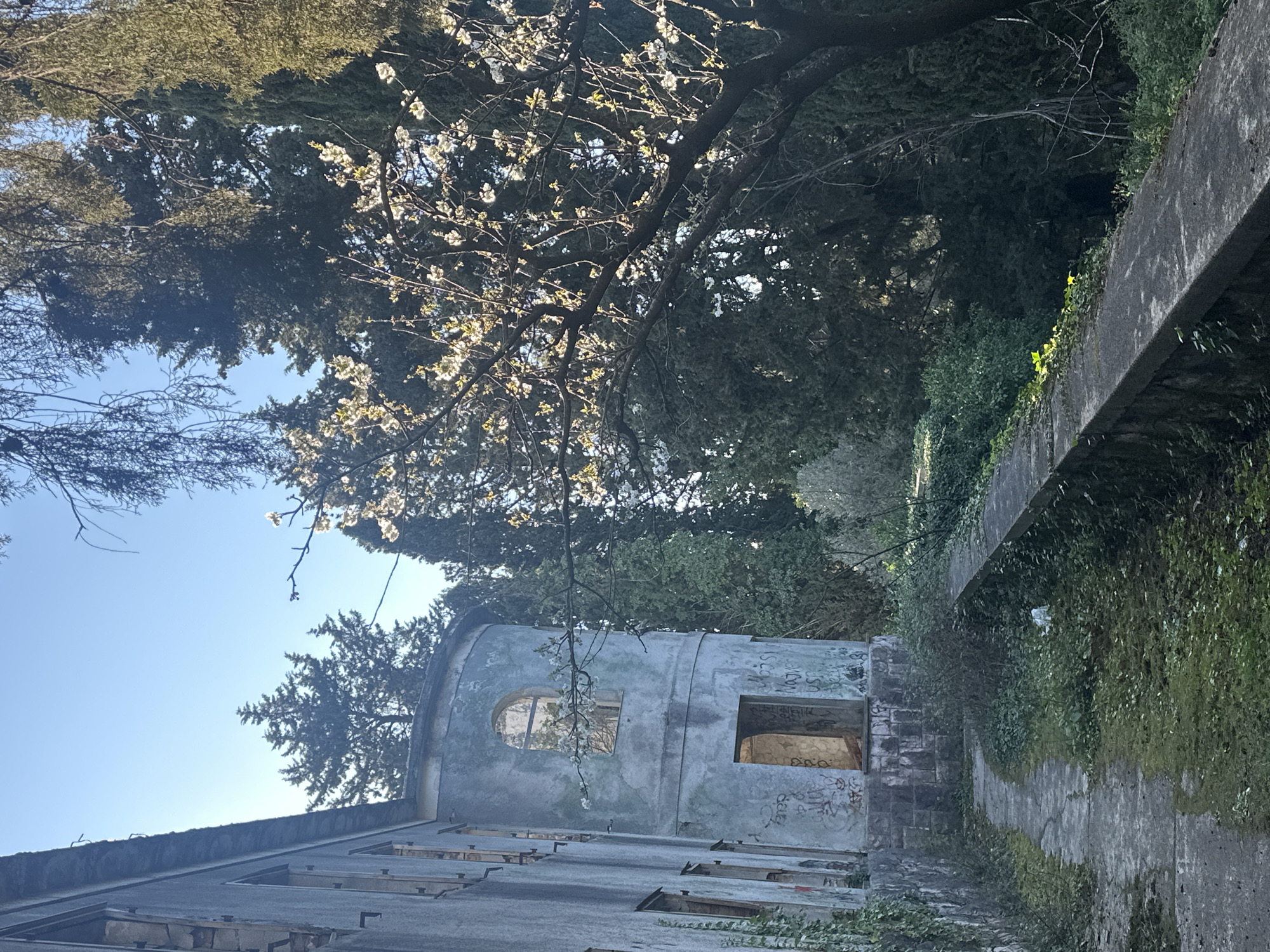 The image depicts an abandoned, dilapidated building with a rounded tower in Tivat, Montenegro. The structure is heavily weathered and covered in graffiti. Several windows are boarded up or open to reveal interior damage. A concrete wall with overgrown ivy borders a path leading away from the building. Trees and a blue sky are visible in the background.