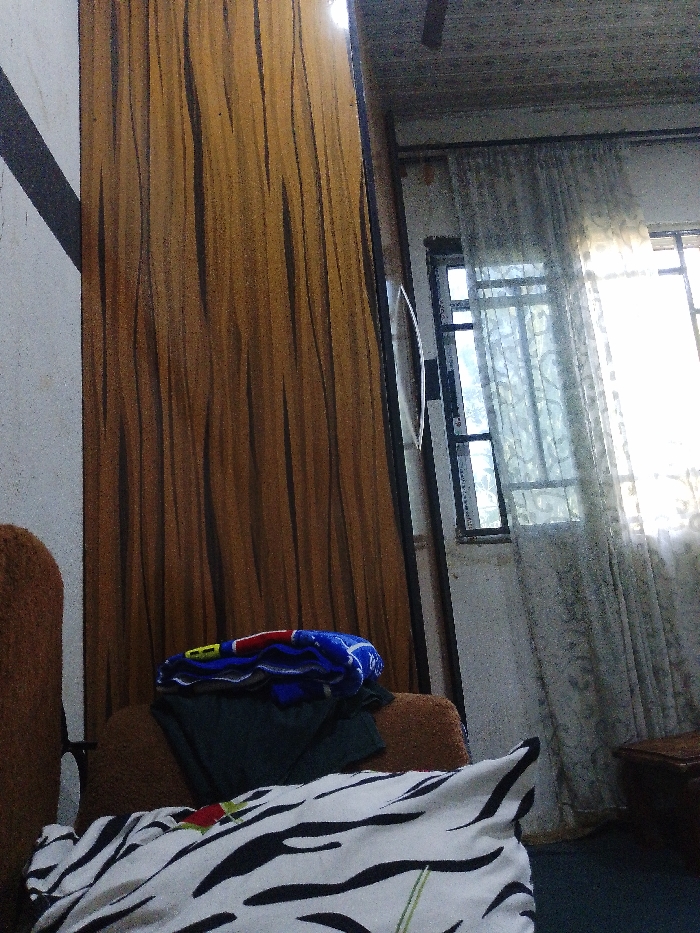 The scene is an interior room located in the city of Unknown, Unknown. A tall, vertically striped brown and black paneled structure occupies the left side of the frame, adjacent to a white wall with a vertical dark line. In the lower-left, a portion of a brown upholstered furniture piece is visible, upon which folded garments rest: a blue item with red and white markings positioned atop a dark green garment. A white pillow with a black zebra stripe pattern is situated in the immediate foreground. To the right, a window with dark frames and security bars is partially obscured by light-colored, sheer curtains, through which bright daylight enters. The adjacent wall is light-toned and exhibits a textured appearance. A dark, rectangular object is partially visible in the lower right. The ceiling features a patterned texture and a dark, possibly circular, object. No individuals are present.