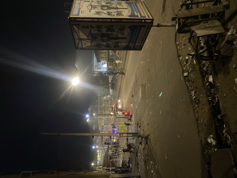 At night, a street illuminated by streetlights shows a scene of urban life. A large billboard advertising motorcycles stands prominently. Further down, a sign reads "AZUBUIKE PLAZA." Motorbikes and some cars can be seen moving along the road. Some people are visible in the hazy and blurred lighting. The roadside shows litter and debris, with a few wooden structures nearby.