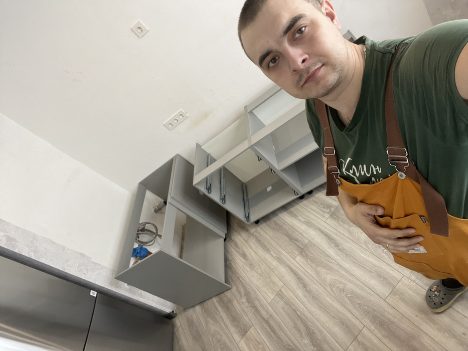 This image depicts the interior of a room in the city of Nekrasovskiy, Russia, appearing to be a kitchen or utility area under renovation. One male individual is visible in the foreground, facing the camera directly. He has short, dark hair and a neutral expression. He is wearing a dark green t-shirt, a mustard-yellow canvas work apron with brown leather straps and silver buckles, and a silver chain around his neck. A silver ring is present on the ring finger of his left hand, which is resting on his abdomen, holding the apron. His left foot, partially visible, is clad in a grey Crocs-style shoe. In the midground, to the left of the individual, are various kitchen or utility cabinet components. A large, dark grey or stainless steel refrigerator is partially visible on the far left. Adjacent to it are two unassembled grey base cabinet frames; the one closest to the refrigerator contains visible plumbing fixtures, including a blue shut-off valve, a white P-trap, and grey flexible hoses. To the right of these are two unassembled white base cabinet frames, oriented diagonally, showing installed metal drawer slides and small black casters on their bases. The walls are painted white and show some minor texture. Multiple white electrical outlets are visible on the wall, including a single grounded outlet and a triple outlet arrangement. The floor is covered with light brown, wood-effect laminate or vinyl planking, laid in a diagonal pattern. The overall scene suggests ongoing construction or installation work.