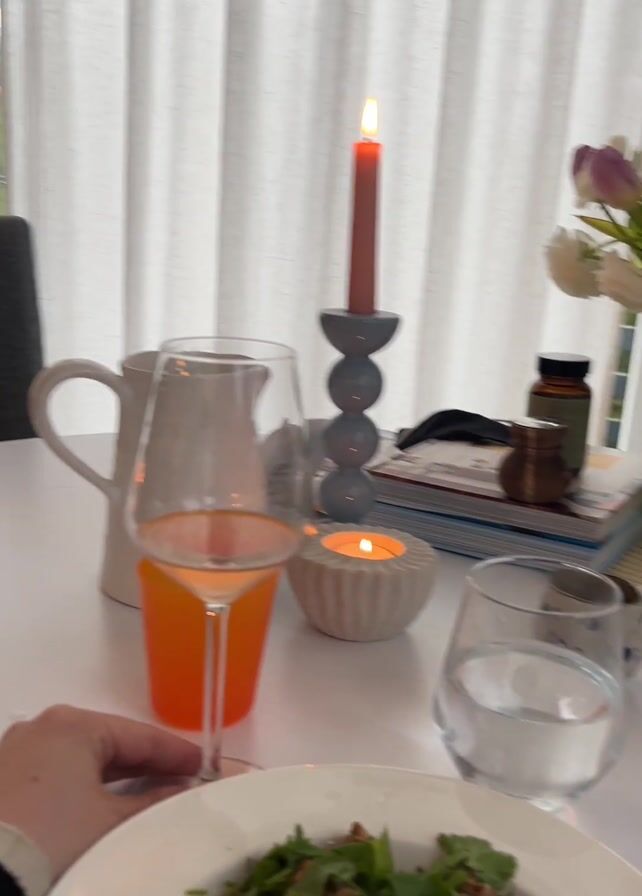 dining table setting with a plate of food in the foreground, garnished with green herbs. Behind the plate is a wine glass filled with a rose-colored drink, and to the side of that is a pitcher. A grey candlestick with a lit red candle and a small decorative candle holder are next to a stack of books, a small jar, and an essential oil bottle. The table is set near a window covered with sheer, light-colored curtains. A chair sits vacant at the table. A baby's hand reaches towards a plate of brown food with a spoon in it. Someone's hands are holding a fork near the first plate. The table appears to be set for a meal.