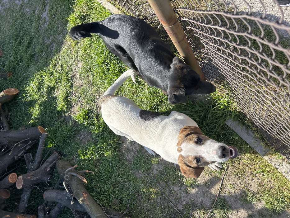 The scene depicts an outdoor environment in Tsalapitsa, Bulgaria, illuminated by bright sunlight. Two dogs are situated on ground composed of green grass interspersed with areas of exposed soil. A white dog with light brown patches on its ears and body, and a pink spot on its muzzle, occupies the central-left area, looking upwards towards the camera with its mouth slightly open. To its right, a black dog is positioned with its head angled downwards, adjacent to a rusty chain-link fence that extends diagonally across the lower right frame. A rusty metal bar is mounted horizontally along the top of this fence. In the upper-left background, a collection of cut tree branches and logs is scattered on the grassy surface. A light-colored concrete block is partially visible on the ground near the fence.
