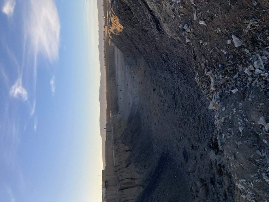 A landscape shot shows a steep, rocky bank on the right filled with garbage. Adjacent to this is a plateau of gray sand, transitioning to a distant, low mountain range. The sky, a gradient of blue to pale yellow, features wispy clouds. A retaining wall or built structure is visible along the edge of the plateau. The photo's orientation is rotated, displaying the horizon vertically.