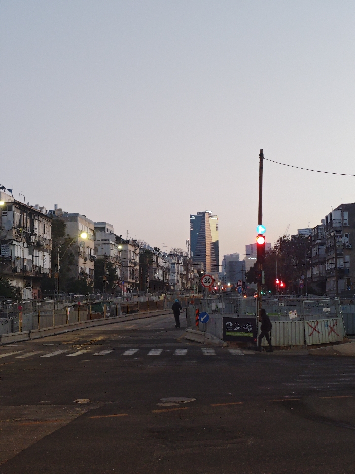 The image displays an urban street scene in Tel-Aviv, Israel, captured during either dawn or dusk, indicated by the pale, gradient sky and illuminated streetlights