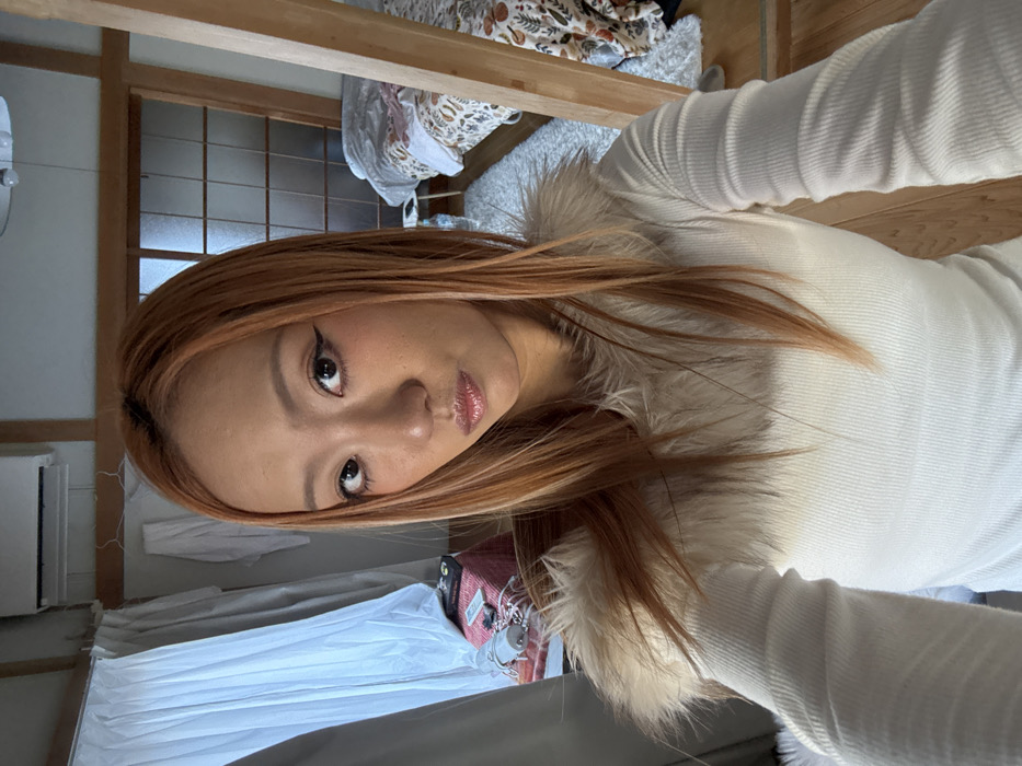 A young woman with honey-blonde hair gazes at the camera. She wears a white, long-sleeved top with a fur collar. Her makeup features winged eyeliner and glossy lips. The background shows a room with a window and a bed covered by a white sheet. There's a wooden structure overhead and various objects scattered around the room. The photo is slightly tilted.