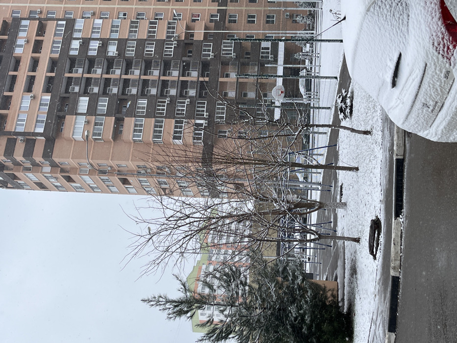 A tall apartment building with many windows dominates the left side of the frame. In the foreground, bare trees and an evergreen bush stand in a snow-covered area. A playground is visible behind the trees. Part of a snow-covered car is on the upper-right. A street with a curb and a manhole cover runs along the right edge of the image. The sky is overcast, suggesting a cold winter day.