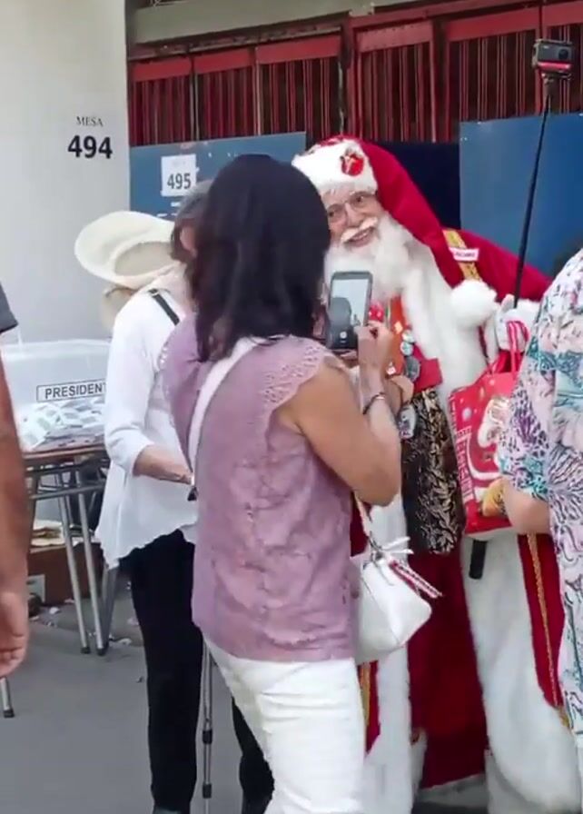 A woman in a pink lace top and white pants takes a photo with a person dressed as Santa Claus, with another woman standing next to her. Santa is holding a red shopping bag with Christmas imagery and a cell phone on a selfie stick. The scene is outdoors, in a public area possibly related to voting. A sign indicating "Mesa 494" is visible. There are other people present but blurred or partially visible. The mood appears light and cheerful, suggesting a festive atmosphere possibly coinciding with an election.