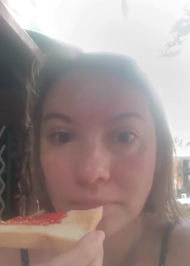 A woman holds a piece of bread with red jam and eats it. She looks directly at the camera with her eyes wide open. Her hair is light brown and her skin appears fair. The background is bright, possibly outdoors, and includes a partially visible green structure.
