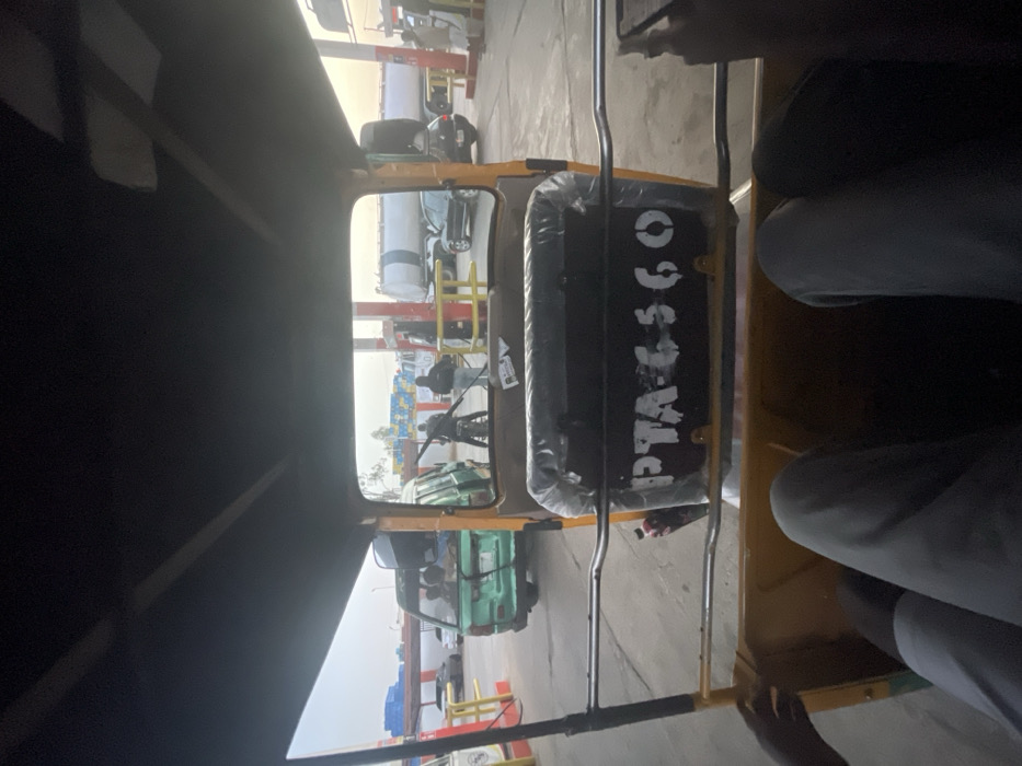 An interior view from an auto rickshaw reveals a scene through the front window. Reflected in the vehicle's side mirror, a green tuk-tuk sits on a paved surface. Further away, various vehicles and structures appear under a bright, overcast sky. The text "PTA-4560" is displayed on a black surface within the auto rickshaw's cabin. A person's legs and arms are visible in the foreground, adding to the sense of being inside the vehicle.