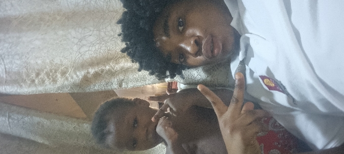 The scene depicts two individuals indoors in Ikeja, Nigeria. A young male on the right, with dark, curly hair, wears a white polo shirt featuring a dark red and gold emblem on the left chest. He poses with pursed lips, looking directly at the camera, while his visible right hand forms a "peace" sign with the index and middle fingers extended. To his left and slightly behind is a younger, bare-chested individual, likely a child, whose lower body is covered by red and white patterned fabric. This second individual also faces the camera, making a "peace" sign with his left hand. The background consists of light-colored, textured curtains with an intricate, swirling pattern. The lighting is diffused, indicating an indoor setting.